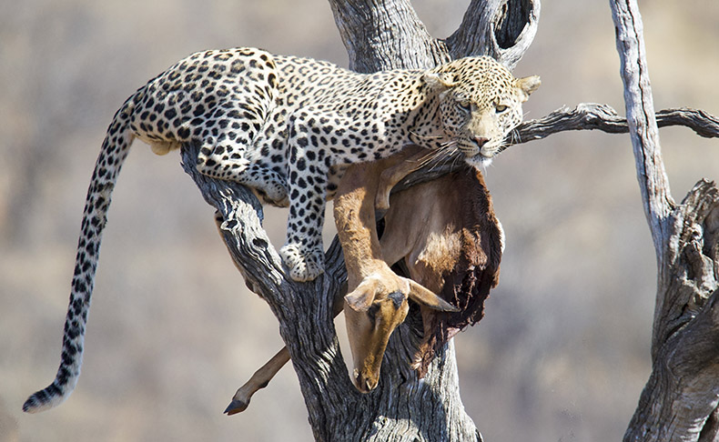 Leopard in Leadwood tree with Impala Kill: Nikon D3S with Sigma 150-600mm lens plus Sigma 1.4x TC @ 840mm, on monopod. f/9, ISO 1600, 1/1000 sec