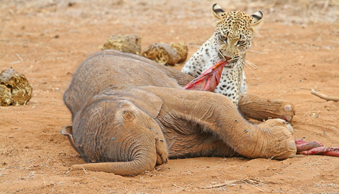 When I arrived I didn't see any dogs but instead saw a dead baby elephant lying on the side of the road! I was wondering what happened to it when I noticed a leopard lying under a bush near the elephant! It then came out and started feeding on the elephant.
