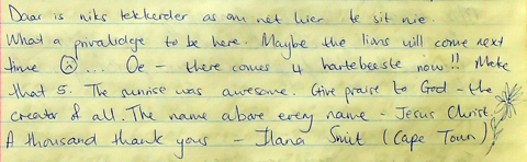 Our favorites are Kielie Krankie and Gharagab as they both have just four cabins and both have panoramic views of the surrounding areas thereby providing magnificent sunsets and sunrises, superb star-gazing as well as solitude and tranquility. Each cabin in these Kgalagadi wilderness camps has a book, kindly donated by Michele Nel, where visitors can record their daily experiences and thoughts...