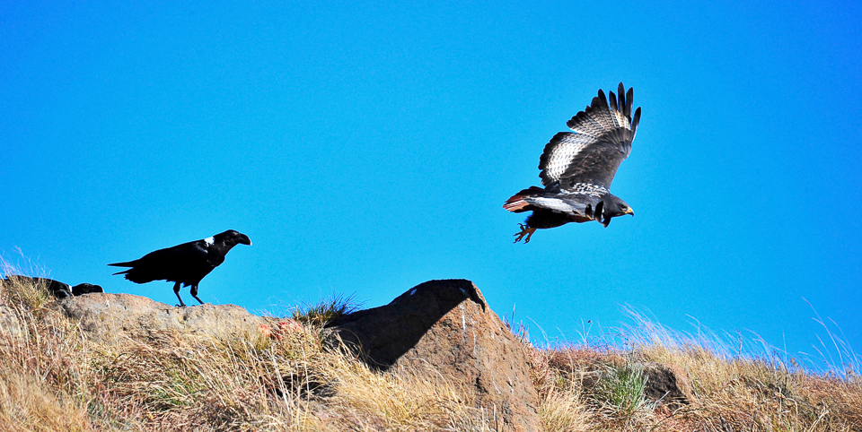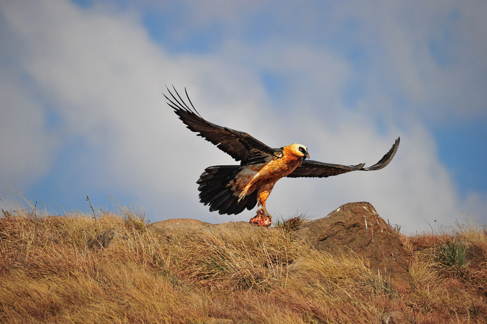 Jeremiah, the Witsieshoek ‘bird-whisperer', places bones from the restaurant kitchen at a specific site close to the newly refurbished chalets in the mornings (weather permitting) to draw the incredibly handsome Bearded Vultures closer, making it an ideal place to photograph these magnificent creatures.