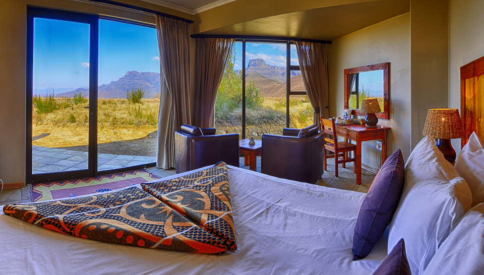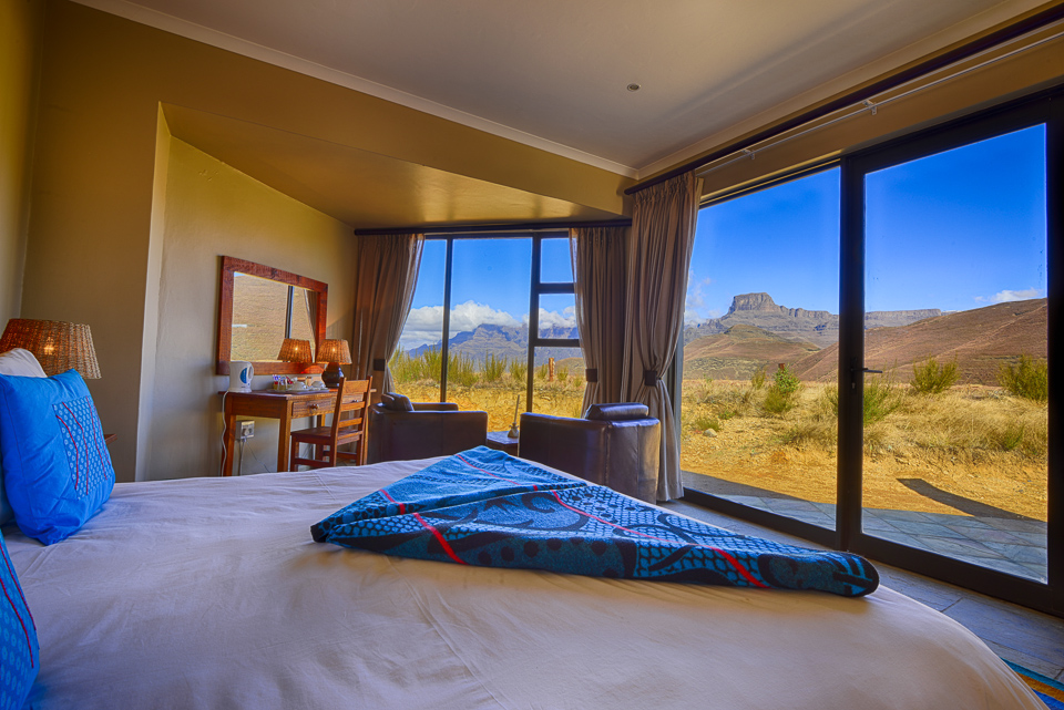 The lodge is perched on a hill with stunning views of the famous Sentinel Peak, Mont-Aux-Sources and Amphitheater.